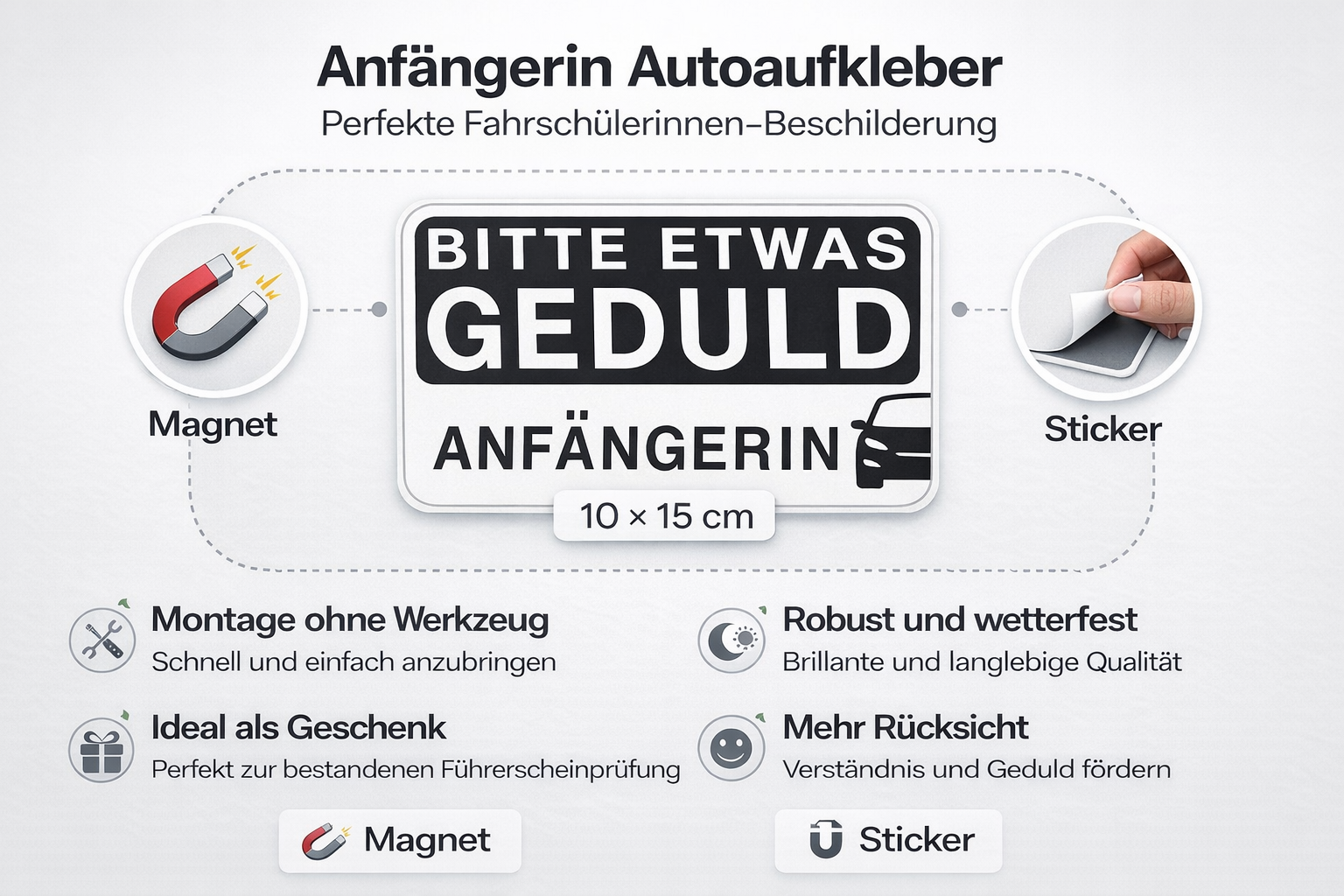 Dieser stilvolle Anfängerin Autoaufkleber ist ideal für Fahranfängerinnen und sorgt für mehr Verständnis und Rücksicht im Straßenverkehr.